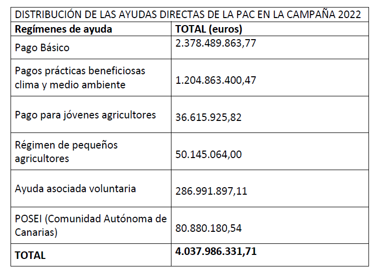Los pagos de ayudas directas de la Política Agraria Común ascendieron a más de 4.037 millones de euros en la campaña de 2022, que se inició el pasado octubre, ha señalado este jueves el Ministerio de Agricultura, Pesca y Alimentación (MAPA).