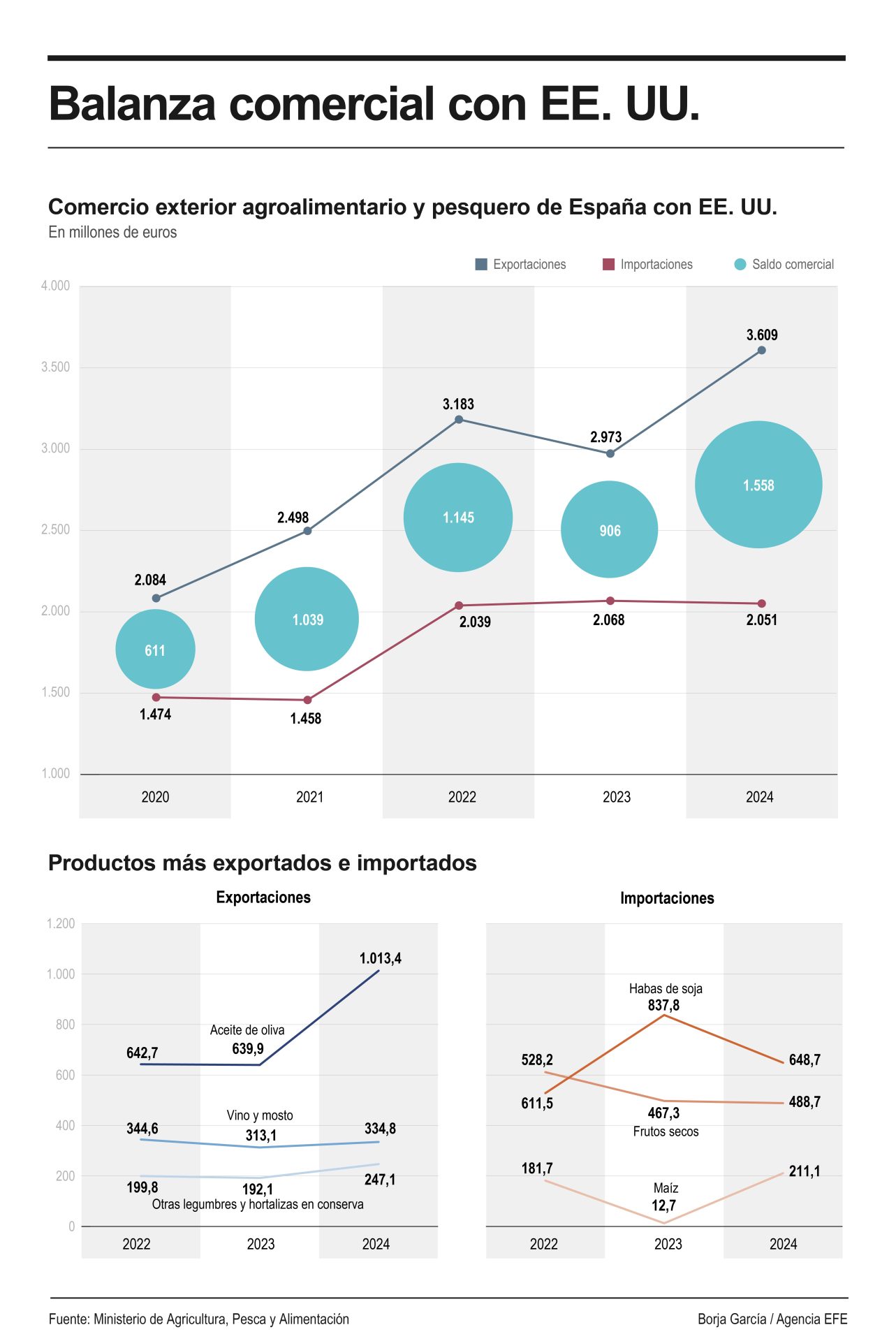 El informe especial realizado por el Ministerio de Agricultura, Pesca y Alimentación sobre el comercio bilateral de exportaciones agroalimentarias y pesqueras con Estados Unidos, refleja que en este mismo periodo las importaciones desde Estados Unidos han crecido, pero a un menor ritmo, en concreto, del 39 %.