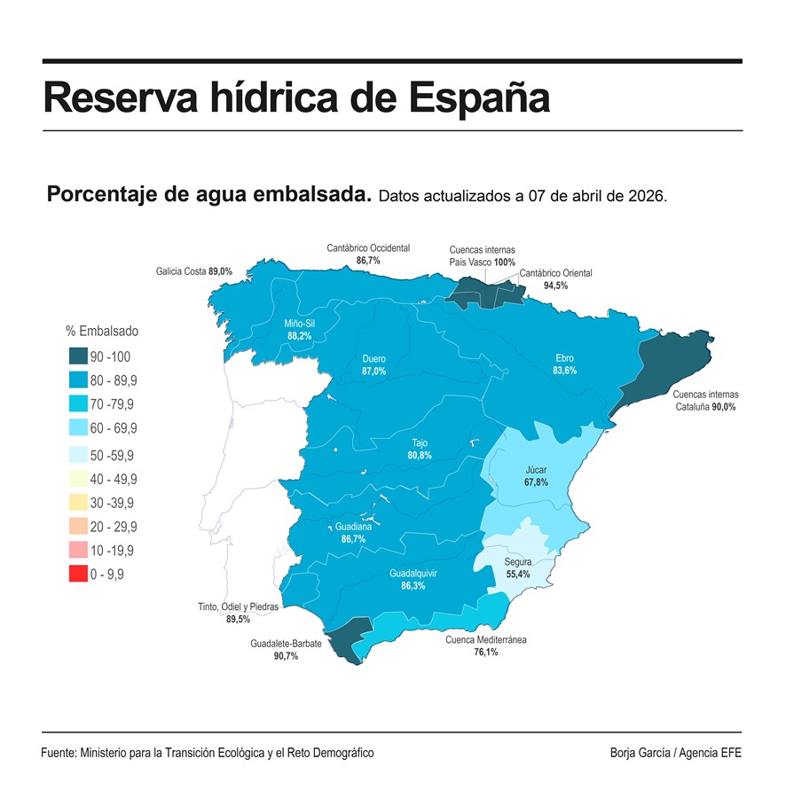 Hasta 13 de las 16 cuencas analizadas se encuentran por encima del 80 % de su capacidad, encabezadas por las de País Vasco (al 100 %), Cantábrico oriental (94,52 %), Guadalete-Barbate (90,7 %) y Cataluña (90 %).
