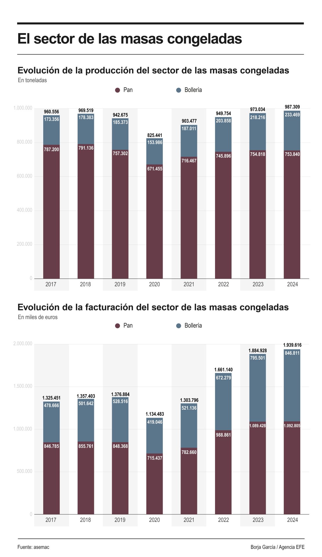 Los datos del último ejercicio de Asemac, que agrupa a las principales panificadoras industriales españolas, detallan que la facturación del pan procedente de masas congeladas fue de 1.092 millones (+0,31 %) mientras que en bollería y pastelería fue de 846,8 millones (+6,45 %), según ha avanzado su secretario general, Jorge de Saja.
