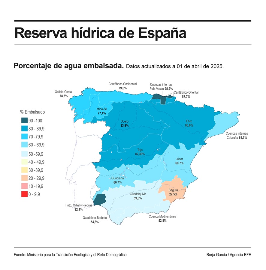 Las grandes cuencas están por encima del 80 % de su capacidad; la del Duero está al 83,9 %; la del Tajo se sitúa en el 82,3 % y la del Ebro, al 85,8 %.