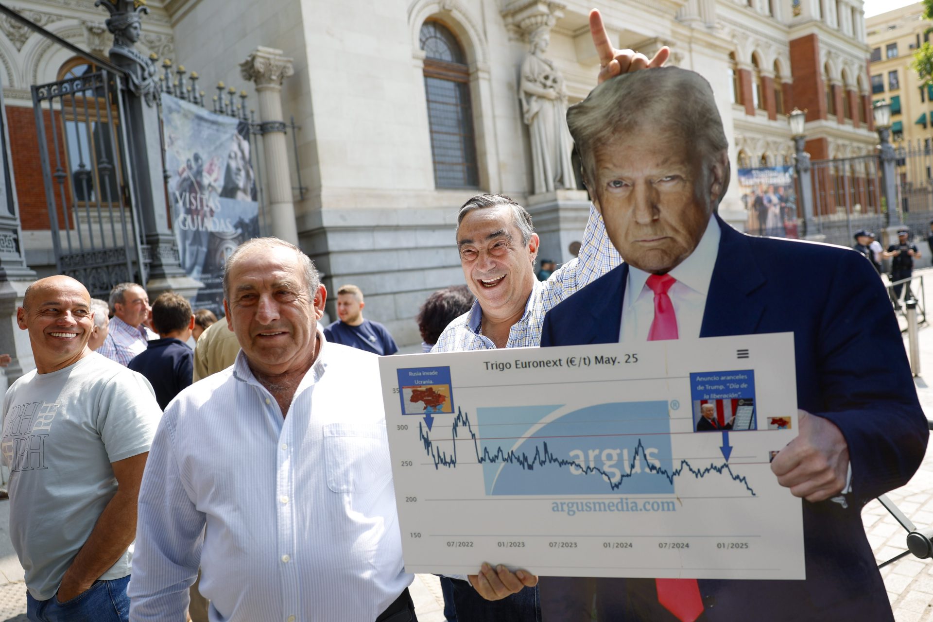 Además, los cerealistas han llevado hasta las puertas de Agricultura dos sacos de cereal y uno de fertilizantes, todo ello, bajo la mirada de dos recreaciones de cartón una de ellas del presidente de Estados Unidos, Donald Trump, y otra del presidente ruso, Vladimir Putin.