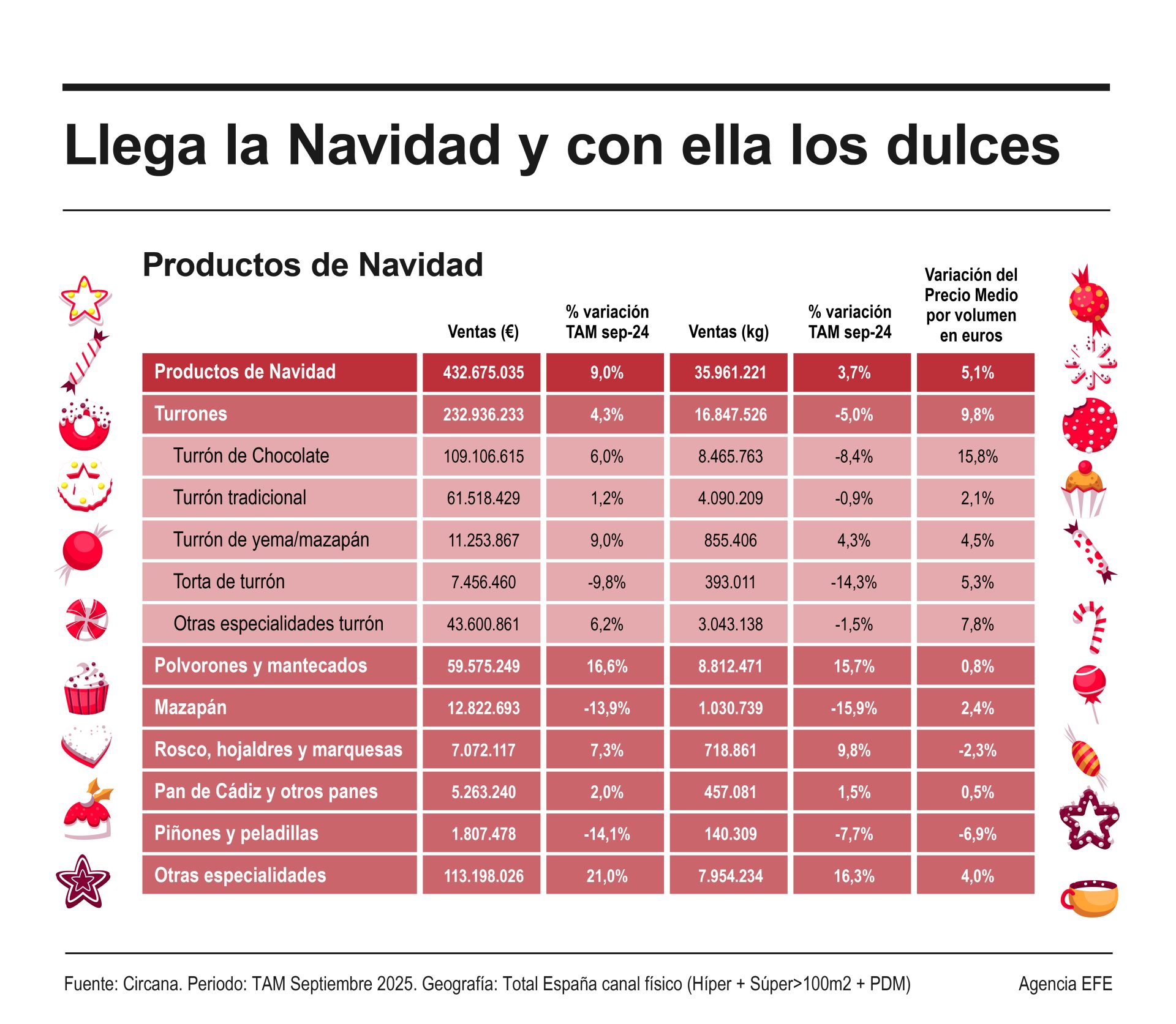 Los datos acumulados de la consultora Circana sobre las ventas de productos de Navidad arrojan que entre octubre de 2024 y septiembre de 2025 la facturación del sector se situó en 432,67 millones de euros, un 9 % por encima de las del mismo año móvil anterior, con un volumen de 35.961 toneladas (+3,7 %) y un alza del precio del 5,2 %.