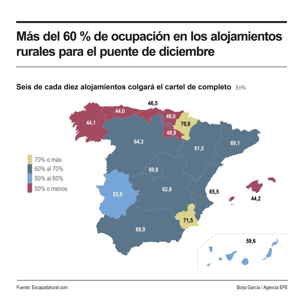 Por su parte la Asociación Española de Turismo Rural (Asetur) ha cifrado también su media nacional en un 60 % y comunidades como Canarias, que gozan de temporada alta turística, a más del 80 %.