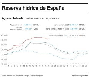 Actualmente la reserva hídrica en los embalses peninsulares acumula 5.177 hm3 más que el año anterior por estas mismas fechas, cuando las cuencas se encontraban con 35.692 hm3.