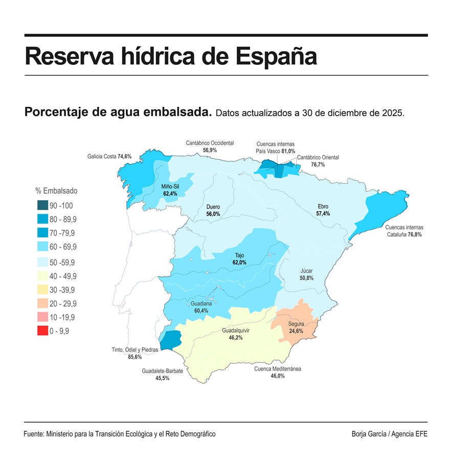 Hasta doce cuencas terminan 2025 por encima del 50 % de su capacidad y, de ellas, ocho por encima del 60 %.
