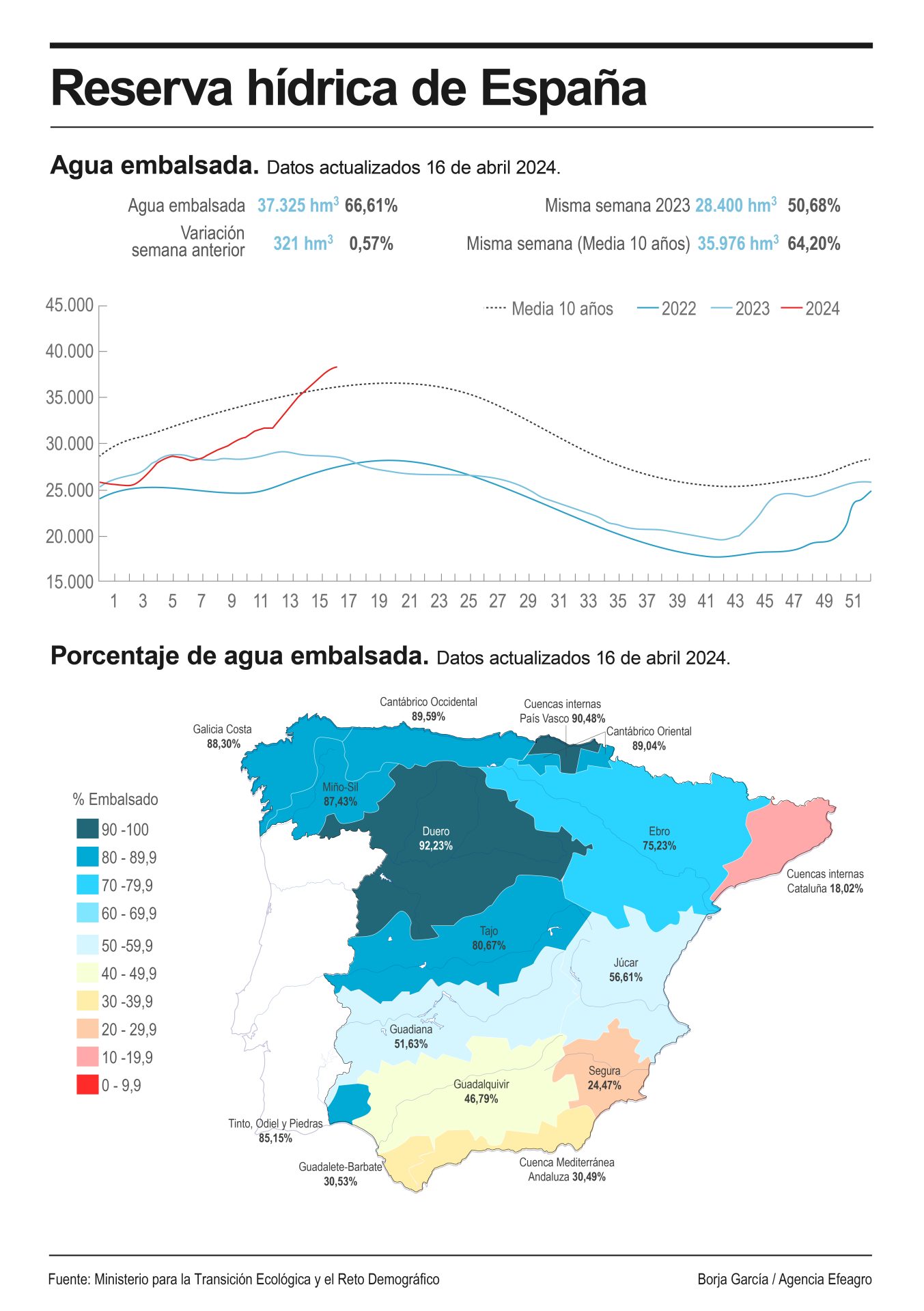La reserva hídrica continúa mejorando y el volumen de agua embalsada se ha incrementado en los últimos días en 321 hectómetros cúbicos (hm³), el equivalente a 0,6 puntos porcentuales del total, hasta alcanzar el 66,6 %, según datos facilitados por el Ministerio de Transición Energética y Reto Demográfico (MITECO).