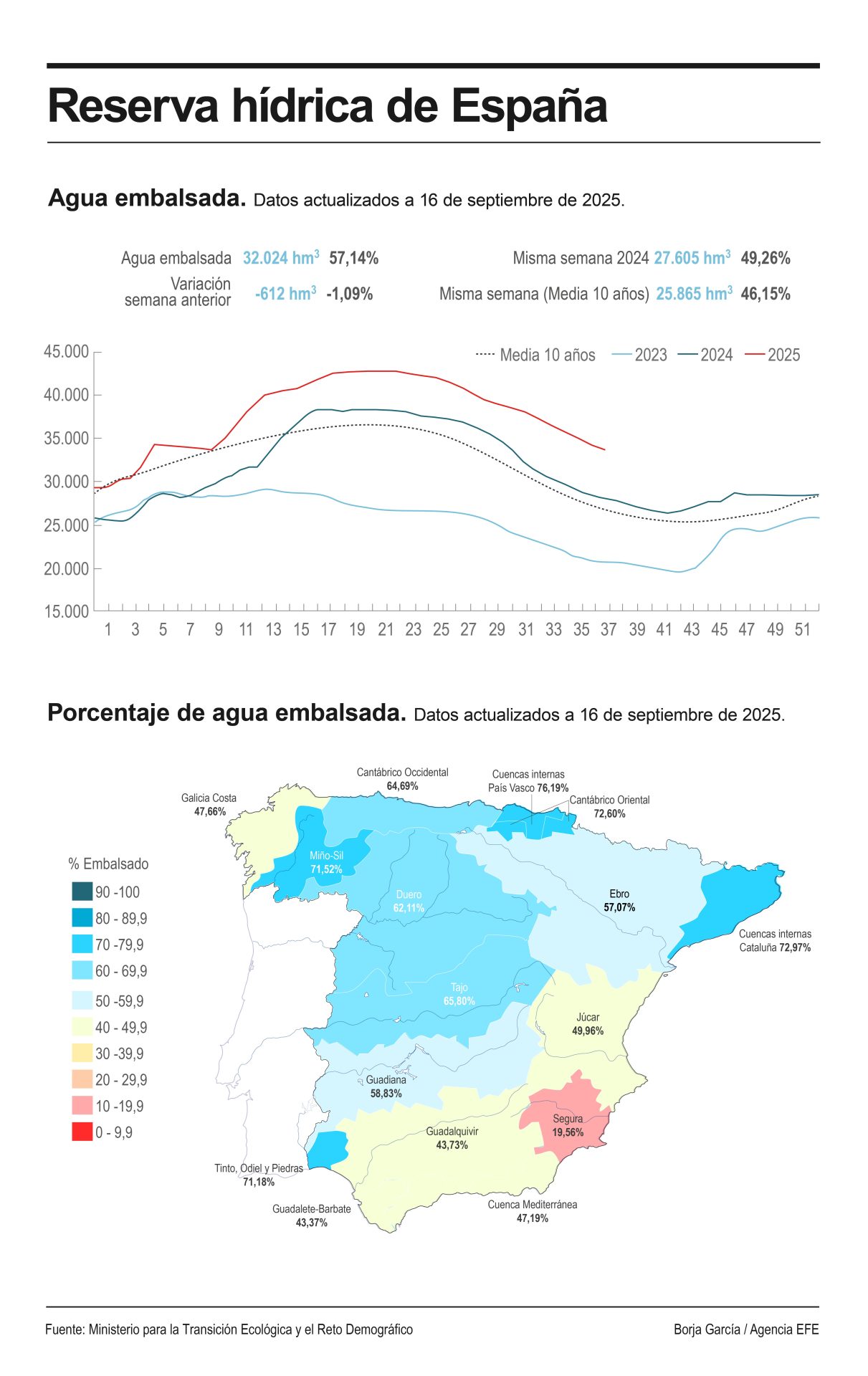 De acuerdo con los datos de MITECO, todas las cuencas han perdido cierta cantidad de recurso a excepción de las internas de Cataluña, que cuentan ahora con un 0,8 % más que la semana pasada, y las del País Vasco, que repiten el mismo porcentaje que en el último recuento.