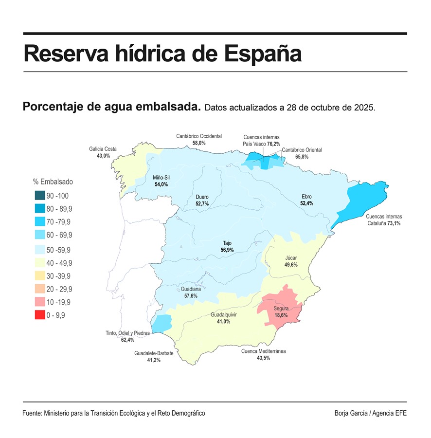 También descendieron los niveles en la Mediterránea Andaluza (perdió un 0,6 %), Ebro (0,5 %) Guadalete-Barbate (0,3 %), Guadalquivir (0,2 %), Cantábrico Occidental (0,2 %) y Guadiana (0,1 %).