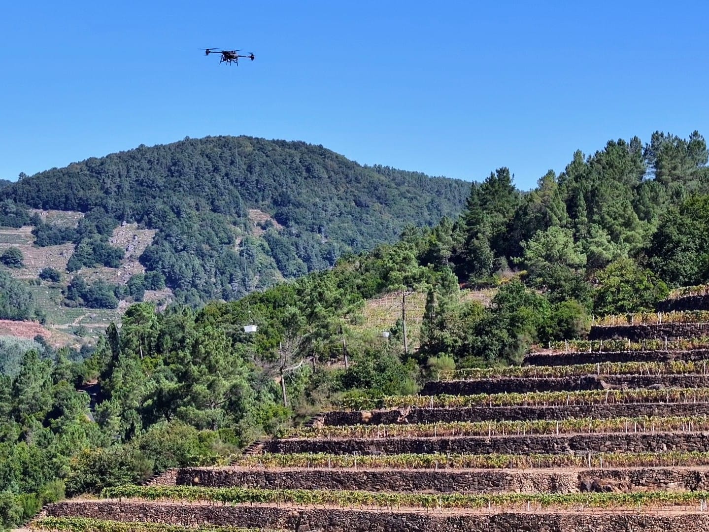 El proyecto ESCAI, liderado por la empresa pública de ingeniería Ineco, puso a prueba con éxito en septiembre en la Ribeira Sacra (Galicia) el uso de drones para trasladar la uva de las zonas más complicadas de la denominación a zonas de acopio y de ahí a las bodegas para facilitar las labores a los viticultores.