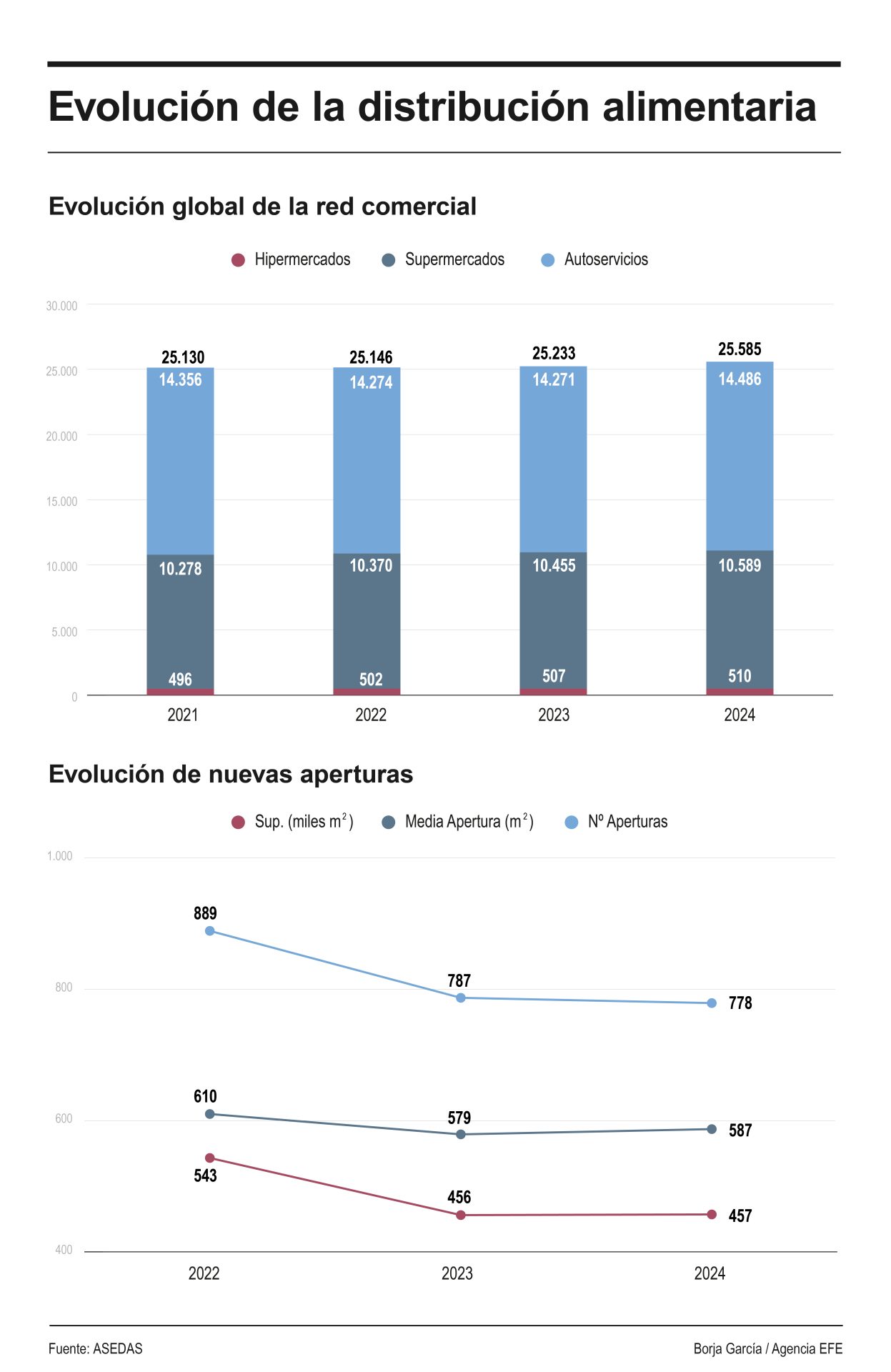 La planta comercial de distribución alimentaria organizada superó en 2024 los 15,3 millones de metros cuadrados, un 1,7 % más que en el ejercicio anterior y prevé seguir creciendo pues se esperan 850 aperturas este año, según el informe de la patronal Asedas con datos de la empresa de análisis "Retail Data".