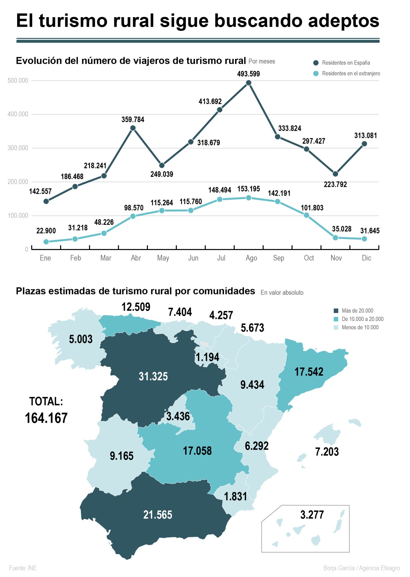 De esta enorme cifra y de acuerdo a la Encuesta de Alojamientos Turísticos Extrahoteleros, solo 84.932 fueron viajeros rurales; 37.408 nacionales y 47.524 extranjeros, un 0,7 %; la oferta para "oficial" de este subsector es de solo 3.277 plazas.