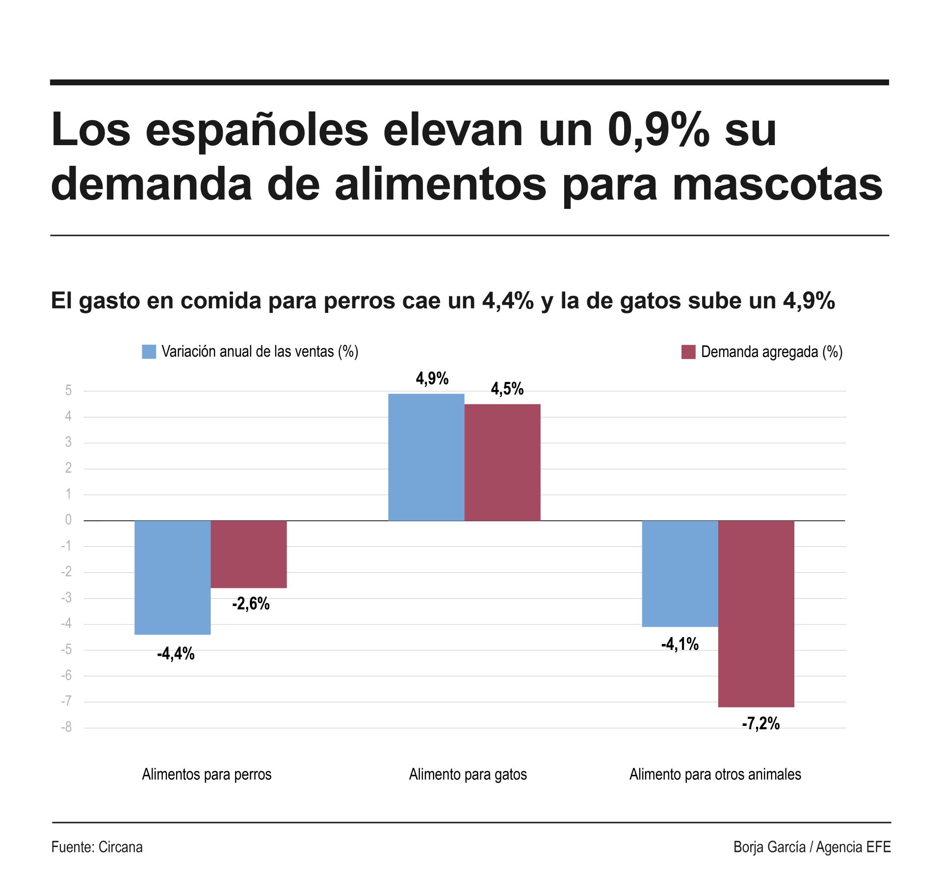 La industria de la alimentación para mascotas sigue en cifras positivas en términos generales en el último año, pero con tendencias diferentes según las especies: el gasto en comida para perros ha caído un 4,4 % anual pero en el caso de los gatos se ha elevado un 5,9 %.