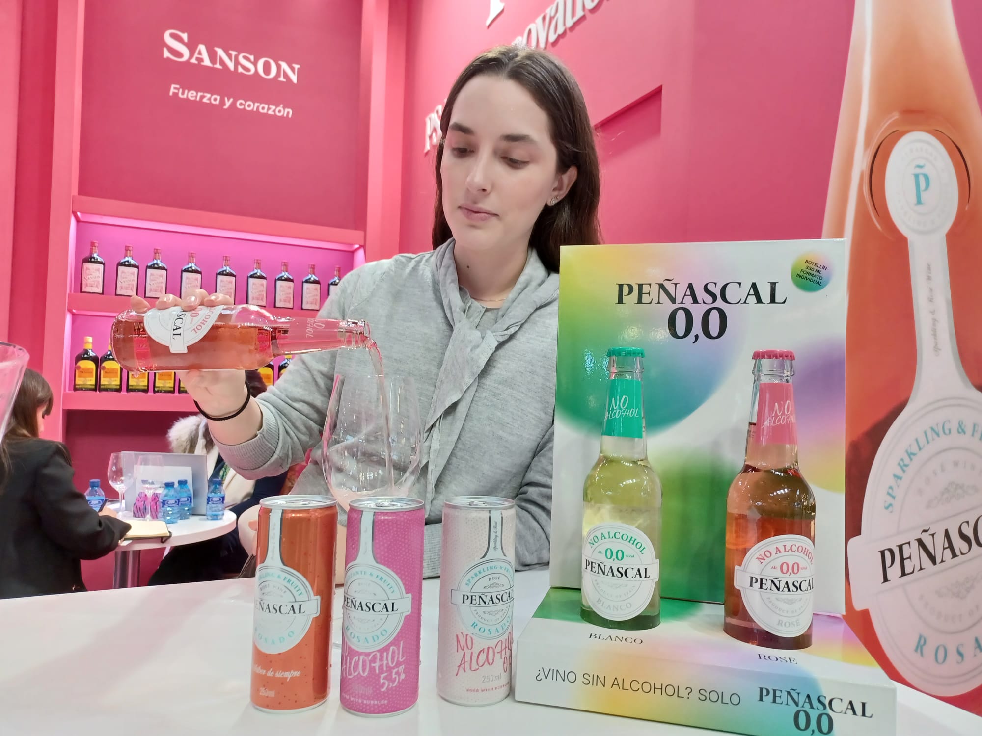 Sofía Sierra, directora de Marketing de PS Wine Innovation (Peñascal), ha acudido a la feria para mostrar un nuevo lanzamiento: botellines (33 cl) de rosado y blanco 0,0 que se suman a la gama de latas sin alcohol de 250 ml -lanzadas en 2022- para adaptarse a "las nuevas formas de consumo", que son más unipersonales.